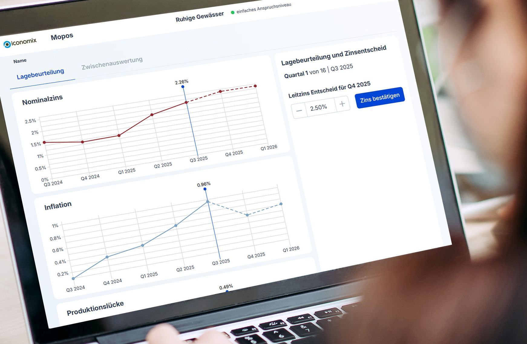 Die beliebte Mopos-Simulation gehörte jahrelang zu den Highlights von Iconomix. Aufgrund technischer und inhaltlicher Einschränkungen wurde sie jedoch 2021 eingestellt. Einer der zentralen Schwachpunkte: Mopos konnte keine unkonventionellen geldpolitischen Massnahmen wie Devisenmarktinterventionen und Negativzinsen abbilden – Instrumente, die seit der Finanzkrise 2007/2008 an Bedeutung gewonnen haben.
