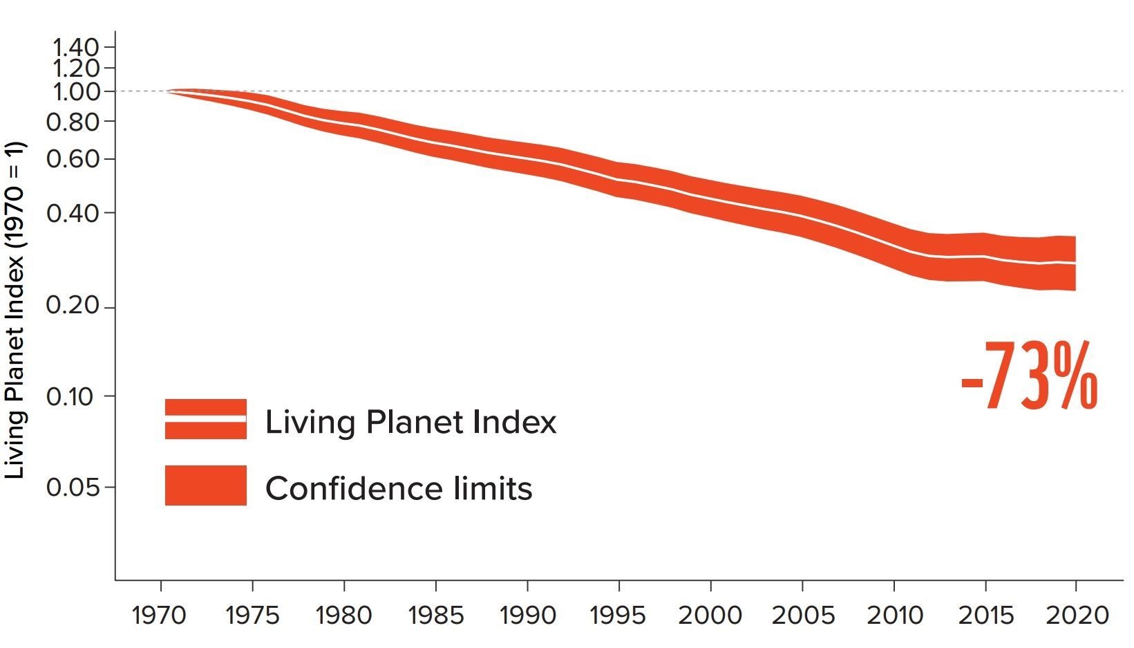 Seit 1970 sind die überwachten Wildtierpopulationen weltweit um ganze 73% zurückgegangen – ein dramatischer Einbruch, der vom Living Planet Index (LPI) auf Basis von Daten zu über 42 000 Populationstrends belegt wird.