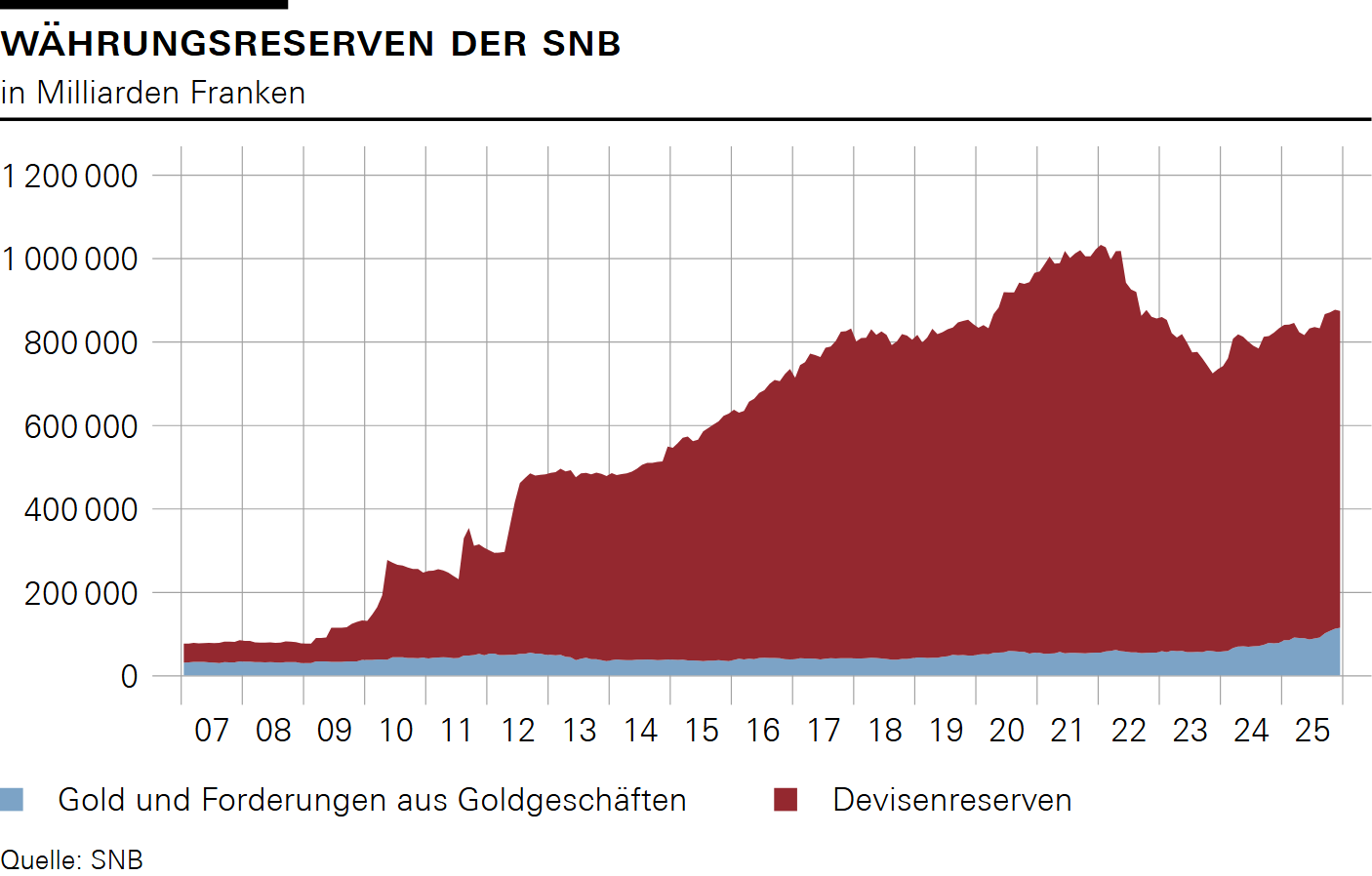Neben der Festlegung des Leitzinses kann die Nationalbank bei Bedarf weiterhin mit zusätzlichen geldpolitischen Massnahmen den Wechselkurs oder das Zinsniveau beeinflussen. Dazu zählen unter anderem Verkäufe von Fremdwährungen im Rahmen der Devisenmarktinterventionen nach der Covid-19-Pandemie. Abbildung 7 zeigt, wie die Devisenreserven seit Anfang 2022 abgenommen haben.