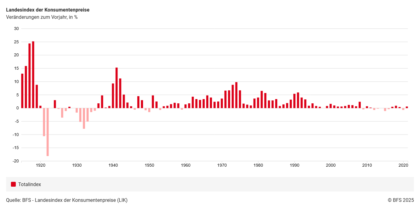 Wie aus dem Balkendiagramm hervorgeht, traten in der Schweiz in den letzten 100 Jahren mehrfach inflationäre und deflationäre Phasen auf. Sehen Sie einen Zusammenhang zwischen geschichtlichen Krisen und Inflationsphasen? Besprechen Sie mit einer Kollegin Ihre Überlegungen und ordnen Sie drei Inflations- oder Deflationsphasen den entsprechenden geschichtlichen Ereignissen zu.