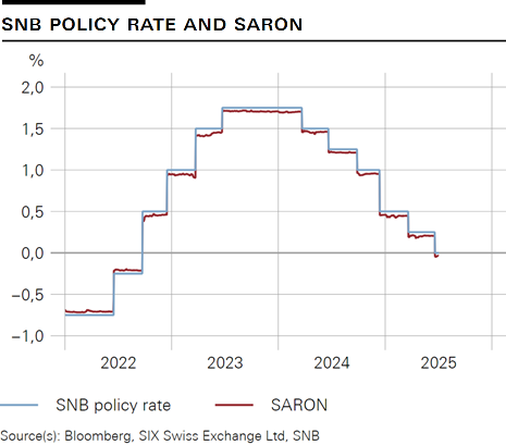 In Switzerland, the SNB pursues its monetary policy objectives by setting the SNB policy rate. This rate indicates the interest rate level that the SNB targets for short-term secured money market rates. The most representative of these money market rates is SARON (Swiss Average Rate Overnight). This is the interest rate at which commercial banks lend each other money on a short-term basis (overnight), against collateral such as government bonds. The SNB seeks to keep SARON close to its policy rate at all times, and can do so by being active directly in the money market.