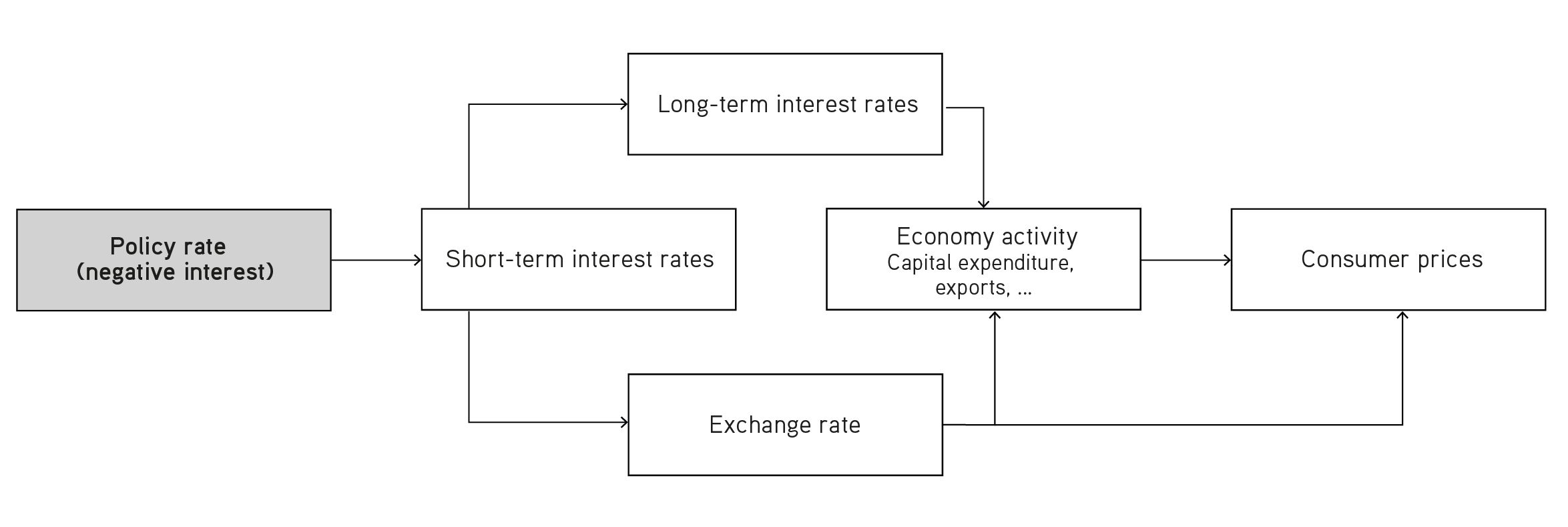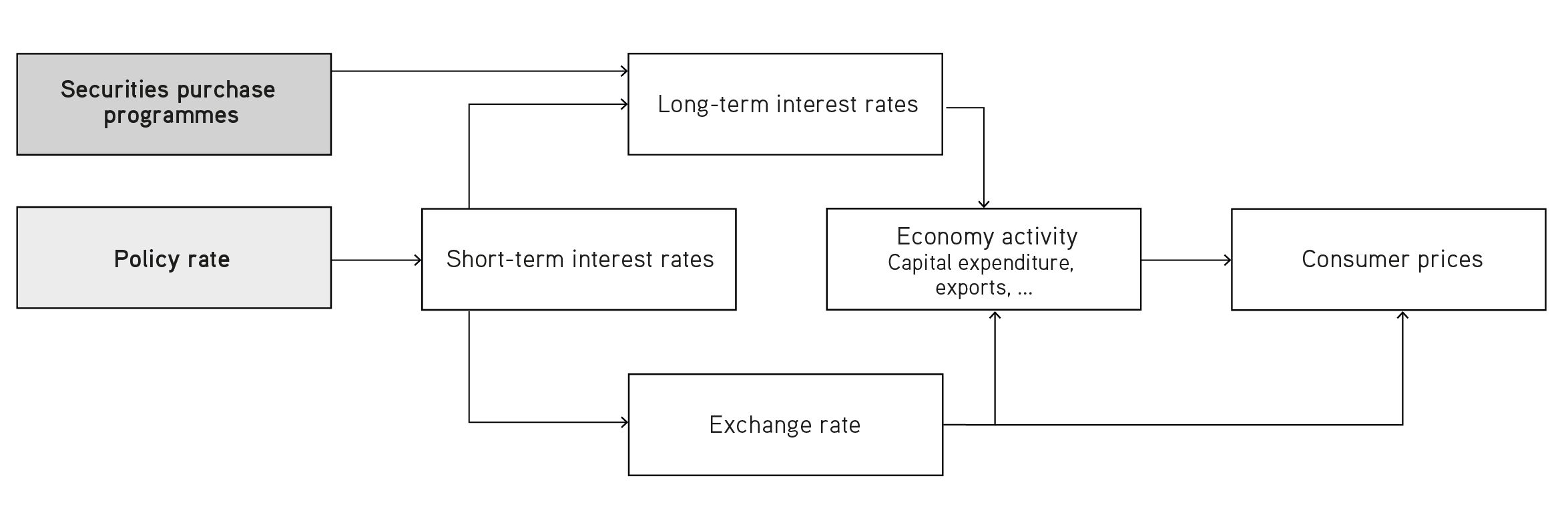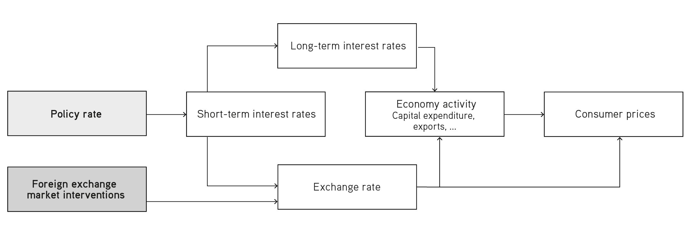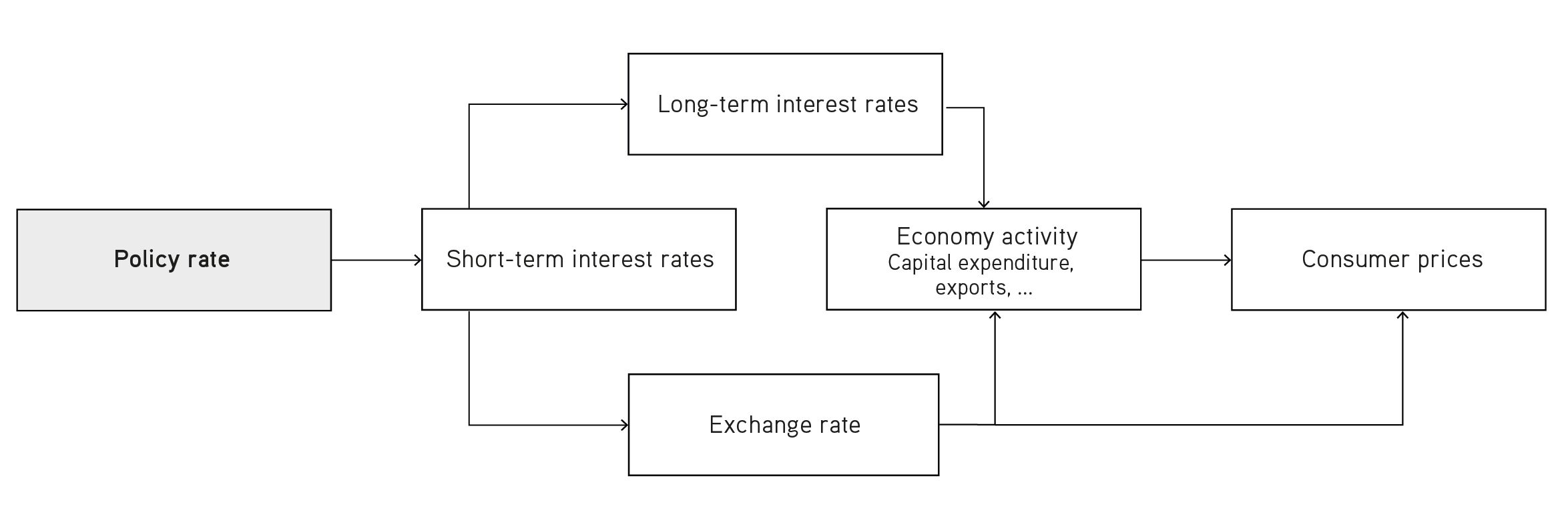 Chart 2 shows the transmission mechanism of monetary policy. The central bank uses its policy rate and money market activities to steer short-term interest rates, such as those for short-term credit transactions. Monetary policy is subsequently transmitted to the economy via other channels.