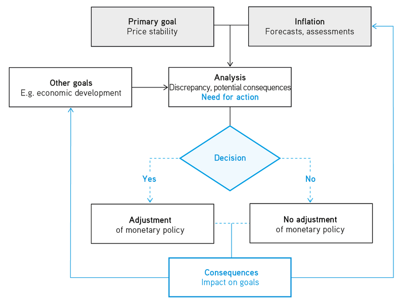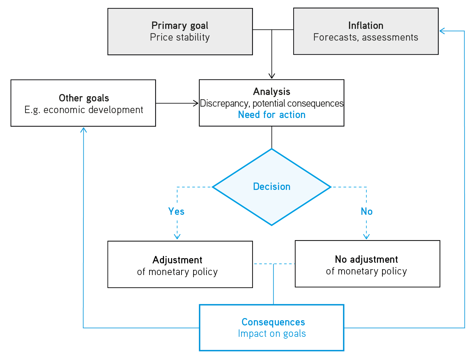 Before a central bank reaches a monetary policy decision, it first analyses inflation developments and the economic situation at home and abroad. It assesses future economic developments and prepares an inflation forecast. This comprehensive analysis is used as the basis for deciding whether monetary policy needs to be adjusted. If expected inflation and economic developments deviate from the objectives, action is required. Chart 1 shows the key aspects of the monetary policy decision-making process.