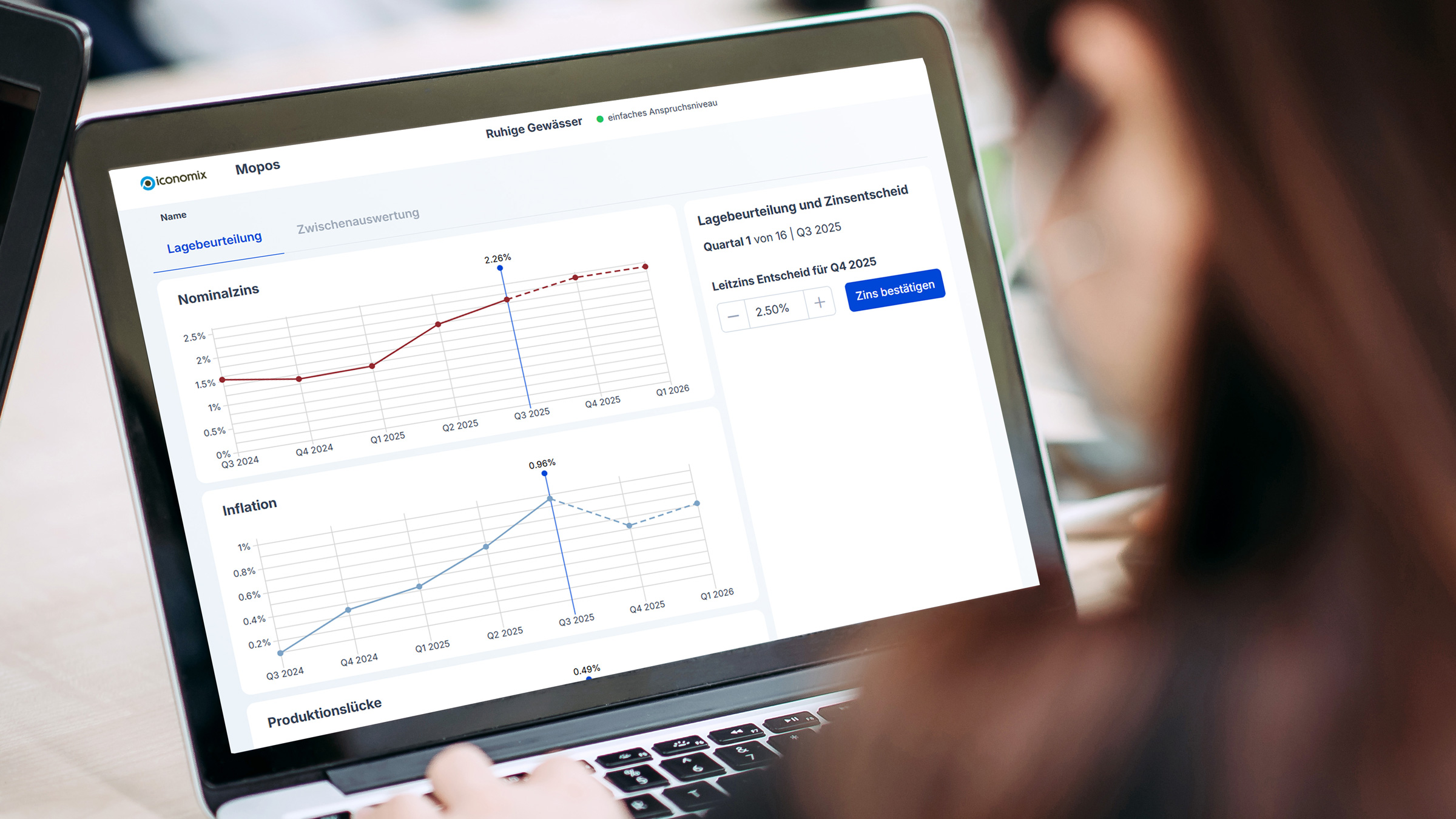 Politique monétaire: mise en pratique Dans la simulation web interactive «Mopos», les élèves peuvent endosser le rôle de membres de la direction d’une banque centrale et prendre des décisions de politique monétaire. Mopos permet non seulement d’expliquer la politique monétaire de manière compréhensible, mais aussi de la rendre accessible et concrète. Le module convient aux EPC, MP, ECG et GYM. | |