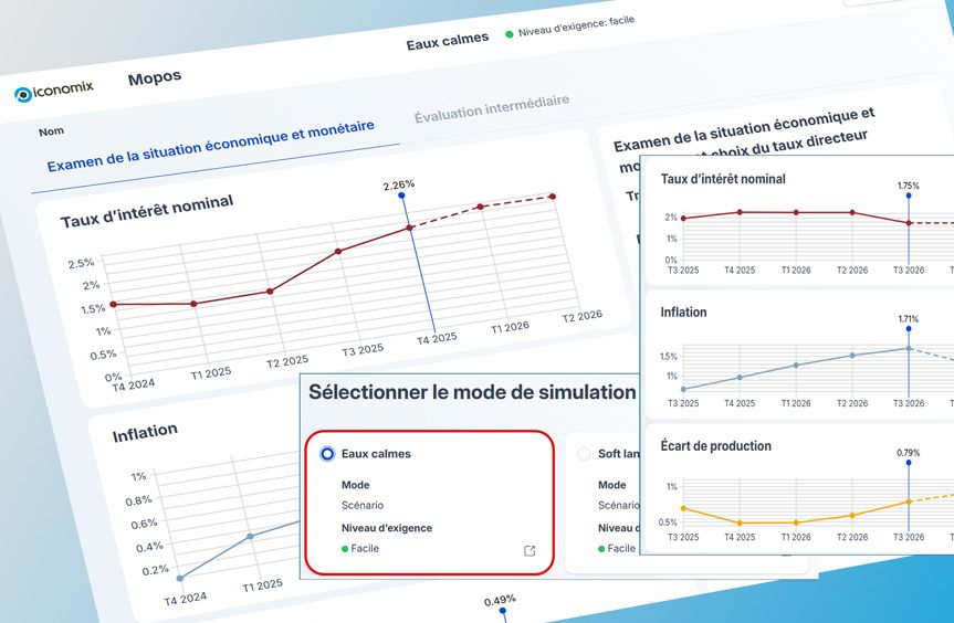 Mopos est une simulation en ligne, qui permet aux élèves de se familiariser avec la complexité de la politique monétaire. Le but est de définir le taux directeur de façon à garantir la stabilité des prix tout en tenant compte de l’évolution de la conjoncture. L’accent est donc mis sur deux facteurs clés: l’inflation et la conjoncture.