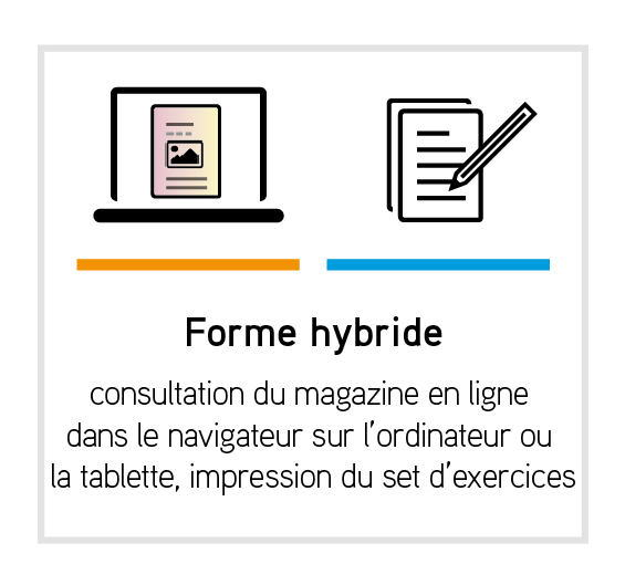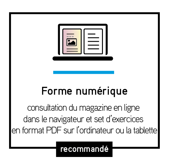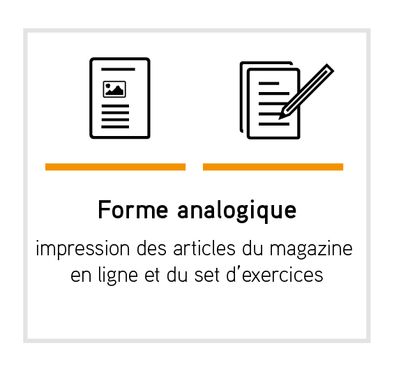 Dans cette version, le cours s’appuie directement sur le magazine en ligne et le set d’exercices. Ce dernier sert de fil conducteur pour traiter le magazine et couvre tous les objectifs didactiques.